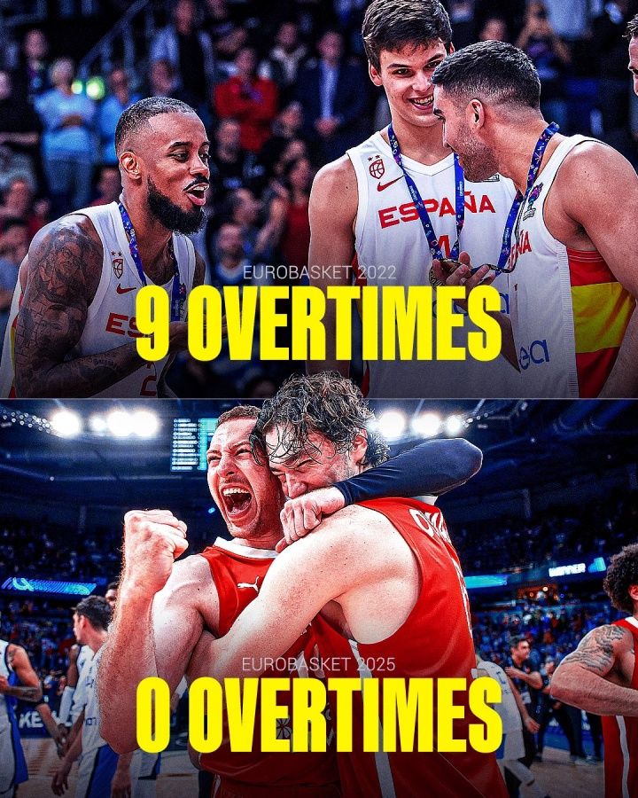 今年欧锦赛至今没有一场加时赛出现,而2022年有7场加时赛,其中2场是双加时,合计9次加时: