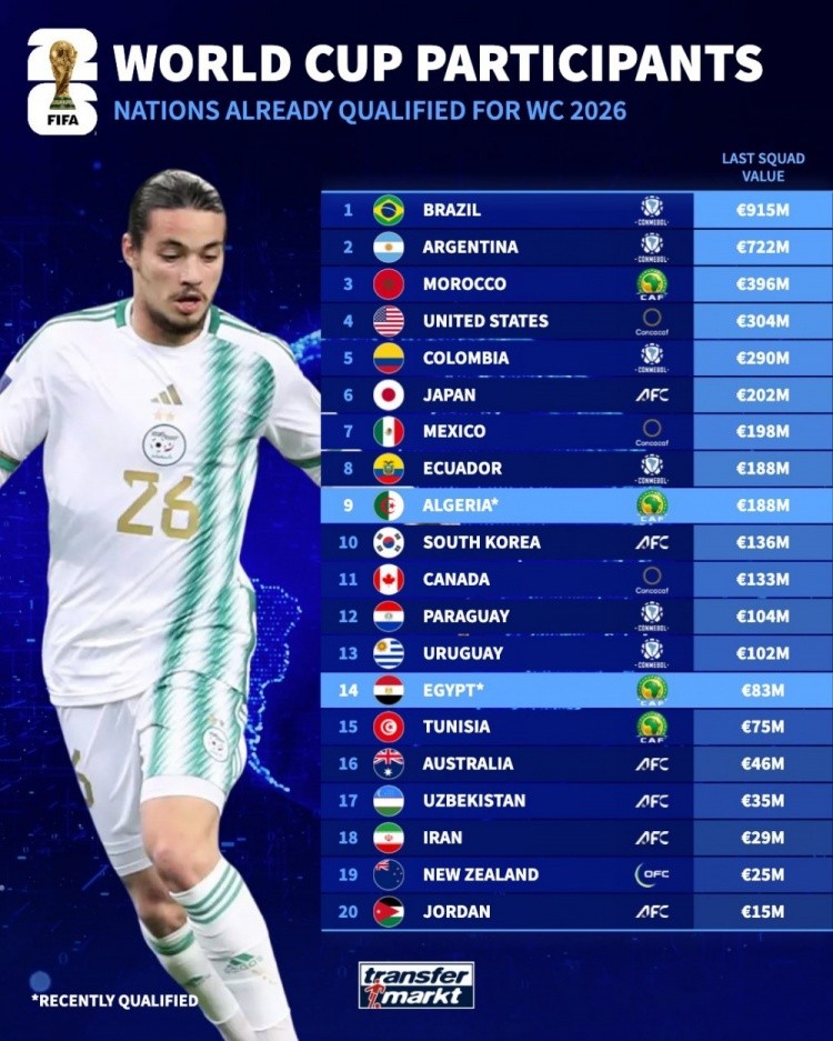 10月10日讯 德国转会市场统计了获得2026年世界杯参赛资格球队的球员身价(上期名单之中的球员),并列出榜单,巴西居首,阿根廷次席。
