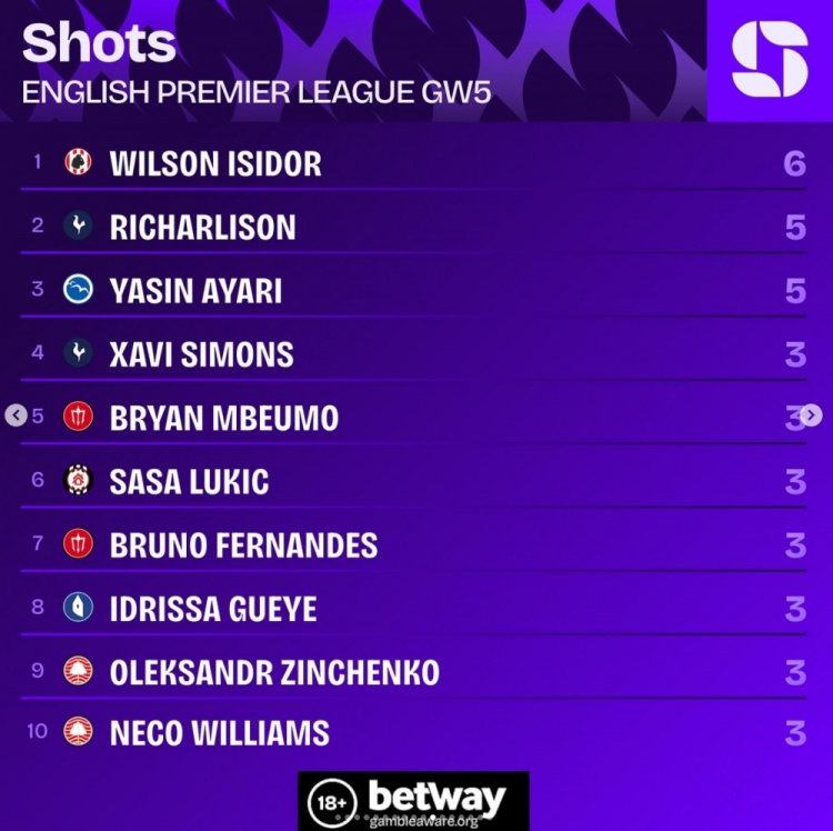 9月24日讯 英超第5轮战罢,squawkafootball列各项数据排行,桑德兰前锋伊西多是本轮射门次数最多的球员,共6次。